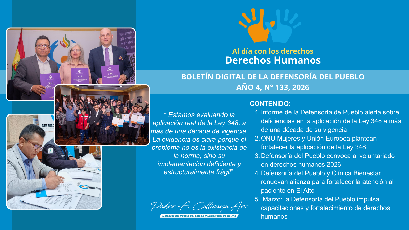 a Defensoría del Pueblo lanzó su nuevo Plan Nacional de Voluntariado en Derechos Humanos 2026, denominado “Voluntad que transforma”, una iniciativa que promueve el voluntariado individual e institucional, con procesos formativos progresivos para fortalecer las capacidades de quienes se sumen al programa. Durante el acto de presentación, el Defensor del Pueblo, Pedro Callisaya, convocó a las y los voluntarios a continuar fortaleciendo el trabajo de la institución defensorial durante la nueva gestión y a ampliar la presencia de la institución en comunidades del país. En la misma actividad se entregaron certificados a las personas que participaron del voluntariado en la pasada gestión. “Este 2025 hemos trabajado por lo menos en 20 ciudades donde nosotros tenemos nuestras oficinas y hemos contado con 601 voluntarios y 46 instituciones, que han transitado este Plan Nacional de Voluntariado”, destacó Callisaya. Asimismo, se reconoció la participación de organizaciones como Dr. Sonrisas Bolivia, la Sociedad Científica de Derecho de la Universidad del Valle y su consultorio jurídico, la Fundación Machaqa Amawta y el Centro de Arte y Cultura Albor, entre otras por el apoyo a la promoción y respeto a los derechos humanos.