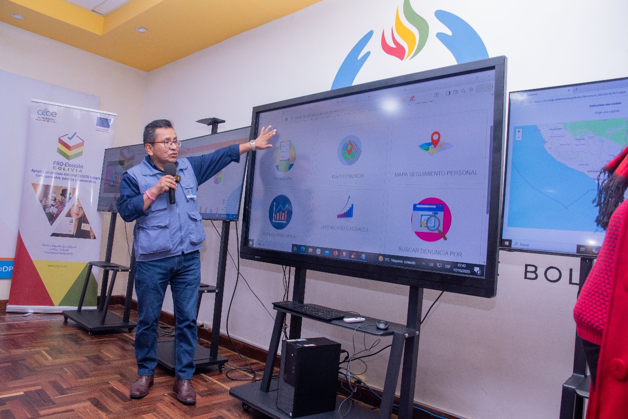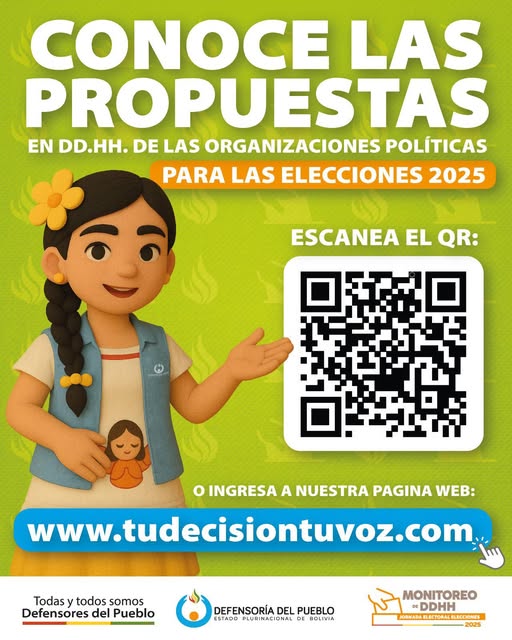 l Defensor del Pueblo, Pedro Callisaya, remarcó la importancia de asistir a la jornada electoral y ejercer el derecho a elegir, pero de manera informada, por lo que recordó que a través de una alianza interinstitucional se tiene la aplicación denominada “Tu decisión, Tu voz”, la cual ofrece información de las propuestas que tienen los candidatos en temas referidos a derechos humanos”. A esta iniciativa, también se sumó otra iniciativa denominada “Conversatorios en Democracia” que son espacios de reflexión sobre el contexto electoral, la cual se desarrolla con instituciones aliadas como la Fundación Friedrich-Ebert-Stiftung - FES Bolivia. Asimismo, la Defensoría del Pueblo, en coordinación con la Fundación Construir y el apoyo de la Unión Europea en Bolivia, realizó un desayuno trabajo para conocer los avances en el aplicativo web “Tu decisión, tu voz”, el cual se enmarca en las acciones conjuntas emprendidas para el fortalecimiento democrático durante el periodo electoral con enfoque en derechos humanos. El aplicativo fue presentado por el equipo Rusysve, el cual fue seleccionado como una de las dos propuestas tecnológicas innovadoras para impulsar el voto informado, en el marco del Hackathon organizado por la Defensoría del Pueblo y la Fundación Construir el pasado 31 de mayo.