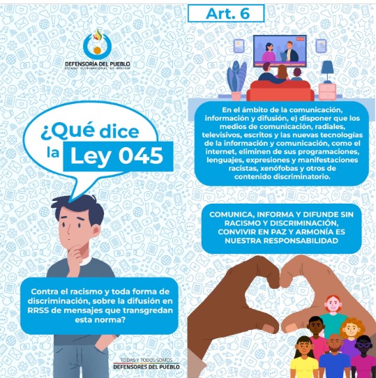 n las Elecciones Generales en Bolivia, las redes sociales se muestran como uno de los principales escenarios de debate político, pero donde también se ha normalizado la difusión de discursos de odio y estereotipos étnicos o regionales. Éstos aluden a la identidad indígena, la procedencia geográfica o la militancia política y se amplifican con facilidad, alimentando una polarización que trasciende lo virtual y afecta la dinámica social. Estas expresiones se emplean para descalificar a las poblaciones vulnerables, reforzando prejuicios históricos y profundizando fracturas culturales. Ante esta situación, el Defensor del Pueblo, Pedro Callisaya, señaló que durante este periodo electoral junto a organizaciones de la sociedad civil se ha realizado un análisis no sólo a las publicaciones sino a los comentarios de la propia gente, que potencia este tipo de discursos. “No sé si la lógica es la limitación y la restricción o si esto debe ir acompañado de todo un proceso de información de sensibilización y concientización acerca de la necesidad de guardar respeto por el ser humano que ante la diversidad es también una potencialidad de nuestro país”, apuntó la autoridad defensorial. De acuerdo al Observatorio Defensorial sobre Racismo y Discriminación, la impunidad del anonimato y la lógica de confrontación propia de las plataformas digitales, impulsan una dinámica donde la agresión se percibe como normal e incluso necesaria para defender posiciones políticas. Esta tendencia afecta especialmente a personas con discapacidad, pueblos indígenas, población LGBTI+ y mujeres, quienes encuentran un entorno hostil para expresar sus opiniones. Aunque la Ley 045 penaliza actos de racismo y discriminación, la falta de mecanismos eficaces de control y denuncia en el entorno digital dificulta la protección de las víctimas y favorece la impunidad. Para el Defensor del Pueblo, esto, en parte, se debe a que no han terminado de sanar las brechas que se han generado desde el 2019 y durante estos últimos años se han potenciado mucho más esta fragmentación y situaciones de confrontación que demuestran que estos discursos de racismo y discriminación son estructurales y que “merecen una atención de fondo que va de un tema normativo, pero acompañado de otro tipo de medidas plasmadas a través de una política pública”.