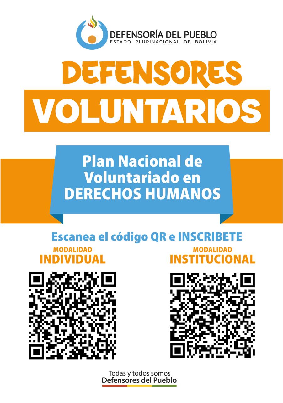 El Plan Nacional de Voluntariado de la Defensoría del Pueblo de Bolivia tiene como misión fortalecer la participación activa de personas y organizaciones en la promoción y defensa de los derechos humanos.