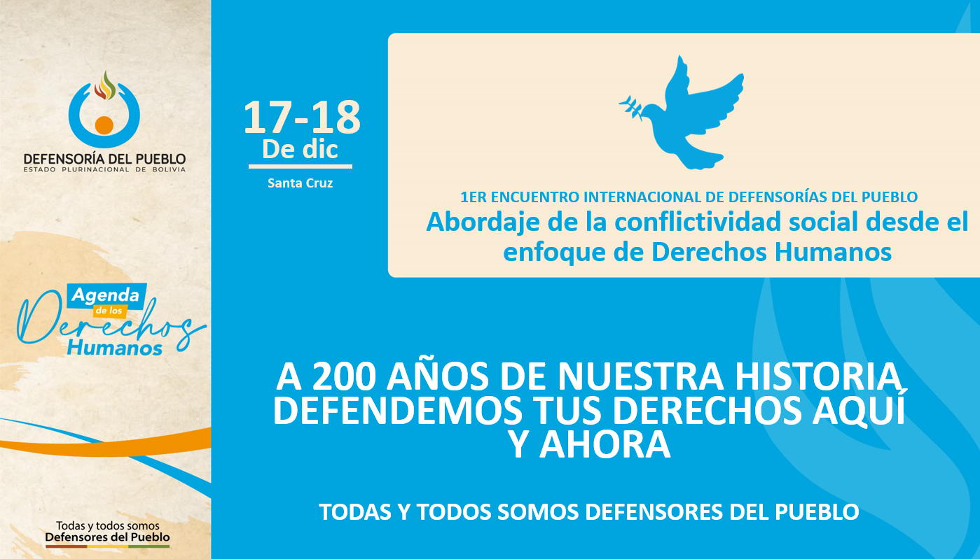 La agenda concluirá el 17 y 18 de diciembre con el 1er Encuentro Internacional de Defensorías del Pueblo “Abordaje de la Conflictividad Social desde el Enfoque de Derechos Humanos”, en la ciudad de Santa Cruz. Este evento contará con la participación de autoridades y expertos de Colombia, Perú, Ecuador, Paraguay, Argentina y Bolivia, quienes abordarán la conflictividad en el contexto regional.