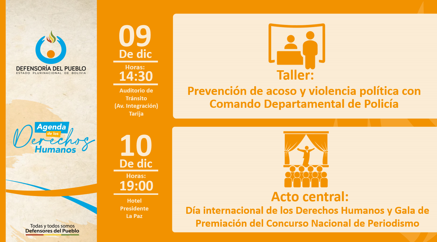 Ese mismo día, Tarija llevará adelante el taller “Prevención de Acoso y Violencia Política”, con el apoyo del Comando Departamental de la Policía. En Sucre se desarrollarán dos actividades: la Feria Interactiva “Promoviendo los Derechos Humanos y la Cultura de Paz desde un Enfoque Restaurativo” y la Feria Interinstitucional “Todos somos Defensores del Pueblo”.