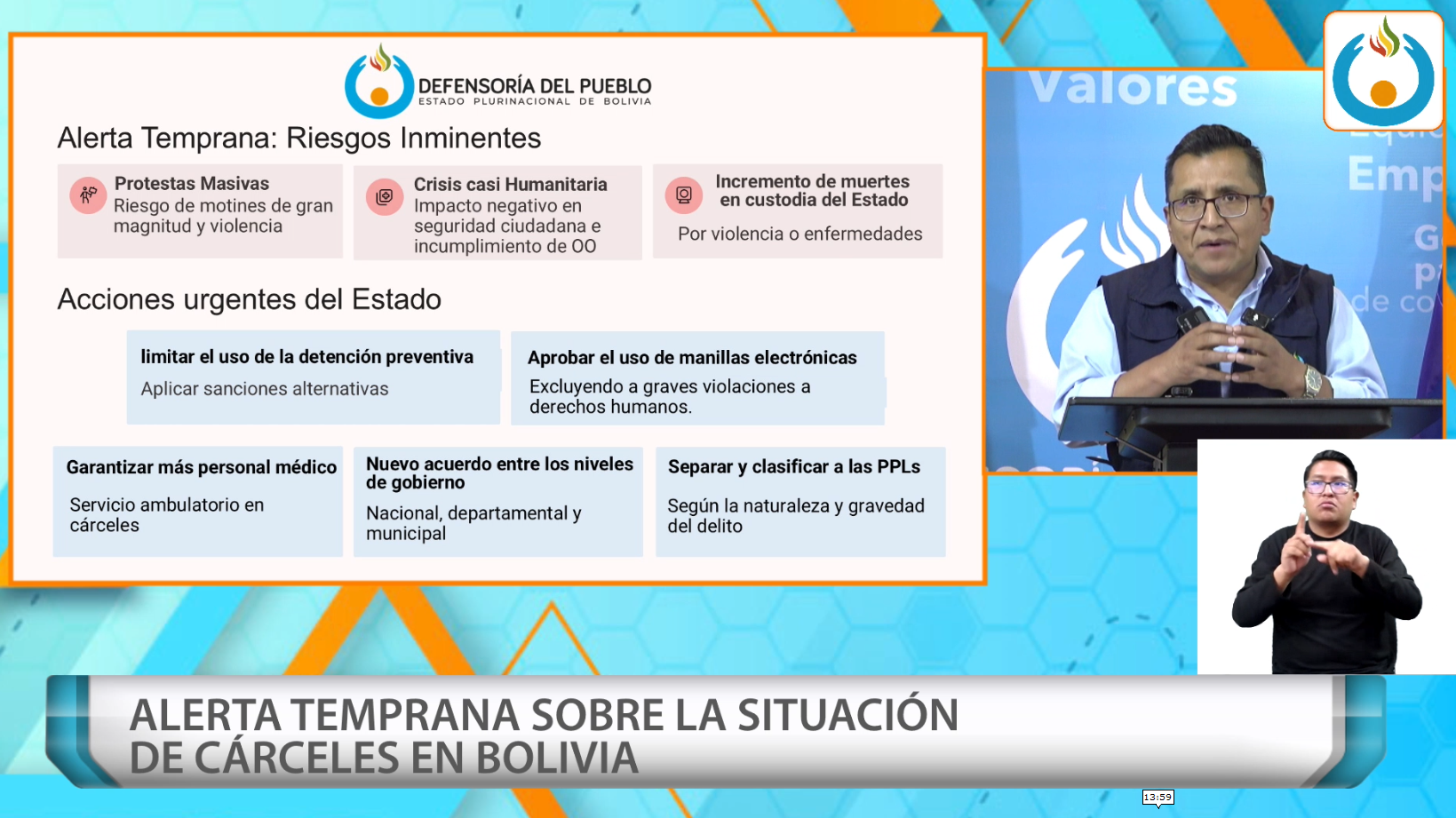 CON EL PEDIDO DE CINCO ACCIONES URGENTES, DEFENSORÍA DEL PUEBLO ALERTA SOBRE SITUACIÓN DE CÁRCELES EN BOLIVIA
