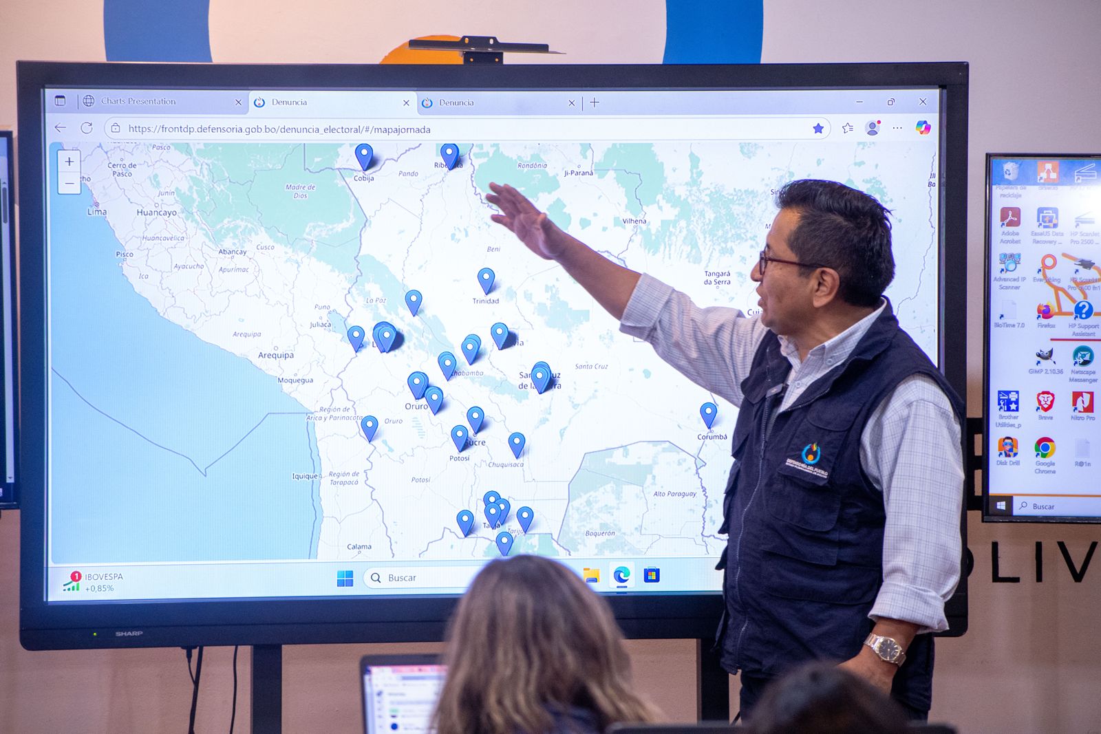 Conectado desde Lima, el Cónsul de Bolivia en Perú, Jorge Ledezma, resaltó la coordinación realizada y afirmó que la jornada democrática se desarrolló “sin inconvenientes”. Por su parte, Juan Marcelo López Barrientos, monitor ciudadano electoral en Lima, valoró la participación de la comunidad boliviana y la presencia de los monitores defensores: “Fue una oportunidad para que la comunidad boliviana se reúna, y la intervención de los monitores y el acercamiento de la Defensoría del Pueblo fue gratamente acogida”, expresó.