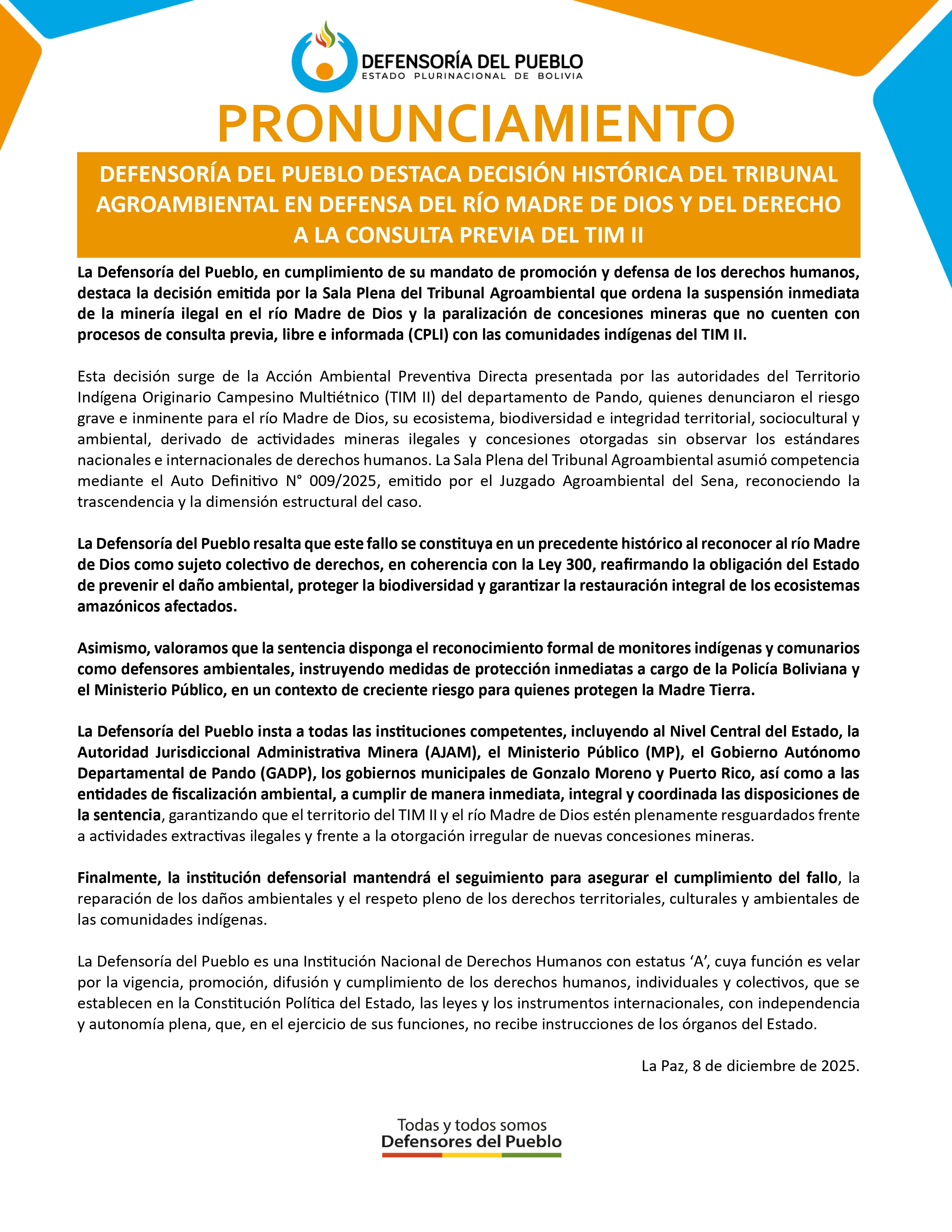 La Defensoría del Pueblo insta a todas las instituciones competentes, incluyendo al Nivel Central del Estado, la Autoridad Jurisdiccional Administrativa Minera (AJAM), el Ministerio Público (MP), el Gobierno Autónomo Departamental de Pando (GADP), los gobiernos municipales de Gonzalo Moreno y Puerto Rico, así como a las entidades de fiscalización ambiental, a cumplir de manera inmediata, integral y coordinada las disposiciones de la sentencia, garantizando que el territorio del TIM II y el río Madre de Dios estén plenamente resguardados frente a actividades extractivas ilegales y frente a la otorgación irregular de nuevas concesiones mineras.