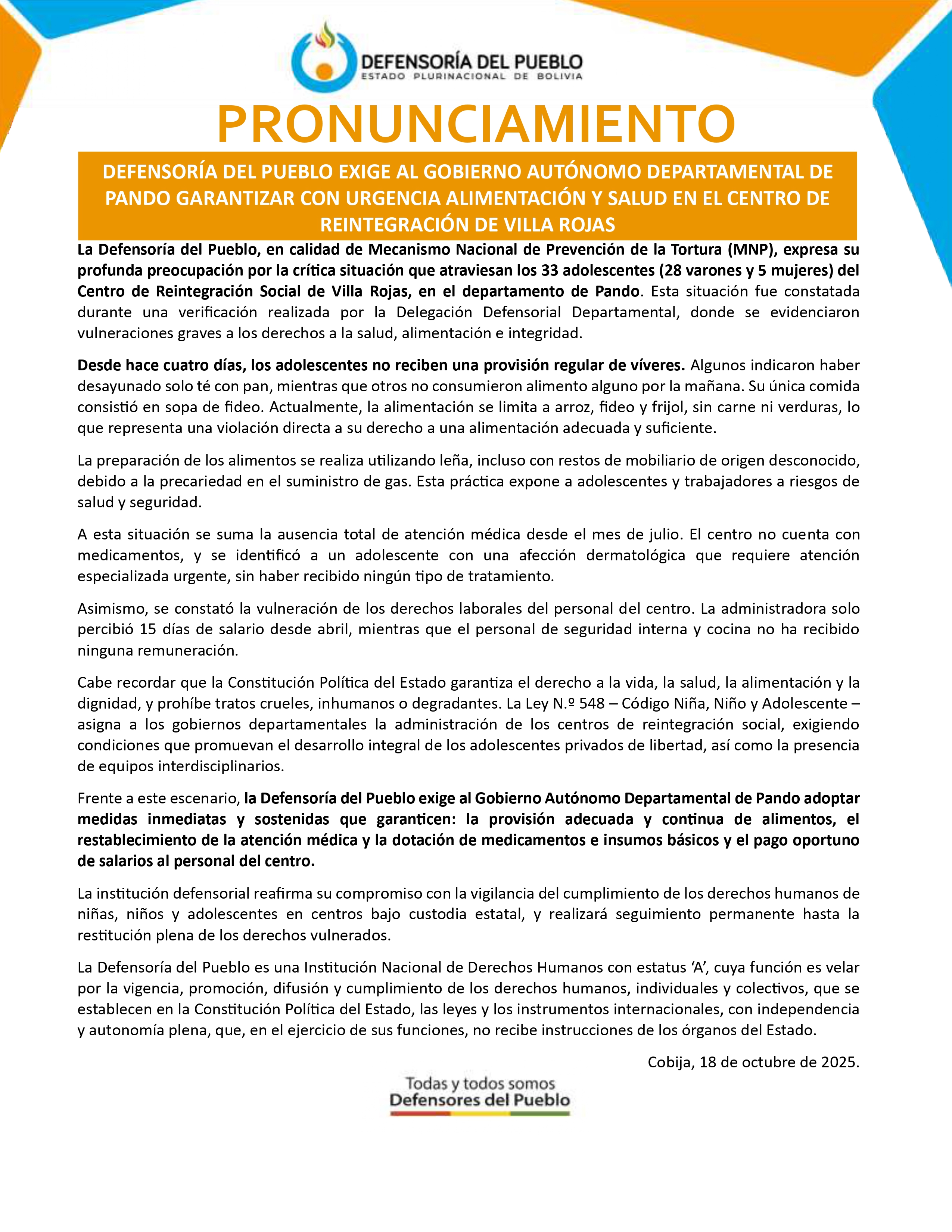 Frente a este escenario, la Defensoría del Pueblo exige al Gobierno Autónomo Departamental de Pando adoptar medidas inmediatas y sostenidas que garanticen: la provisión adecuada y continua de alimentos, el restablecimiento de la atención médica y la dotación de medicamentos e insumos básicos y el pago oportuno de salarios al personal del centro.