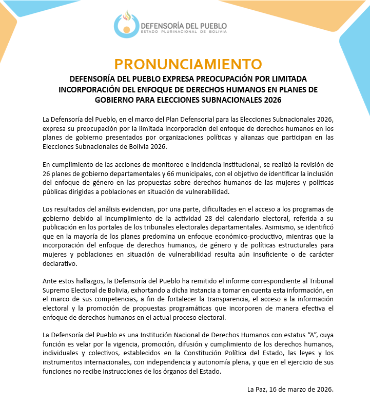 DEFENSORÍA DEL PUEBLO EXPRESA PREOCUPACIÓN POR LIMITADA INCORPORACIÓN DEL ENFOQUE DE DERECHOS HUMANOS EN PLANES DE GOBIERNO PARA ELECCIONES SUBNACIONALES 2026