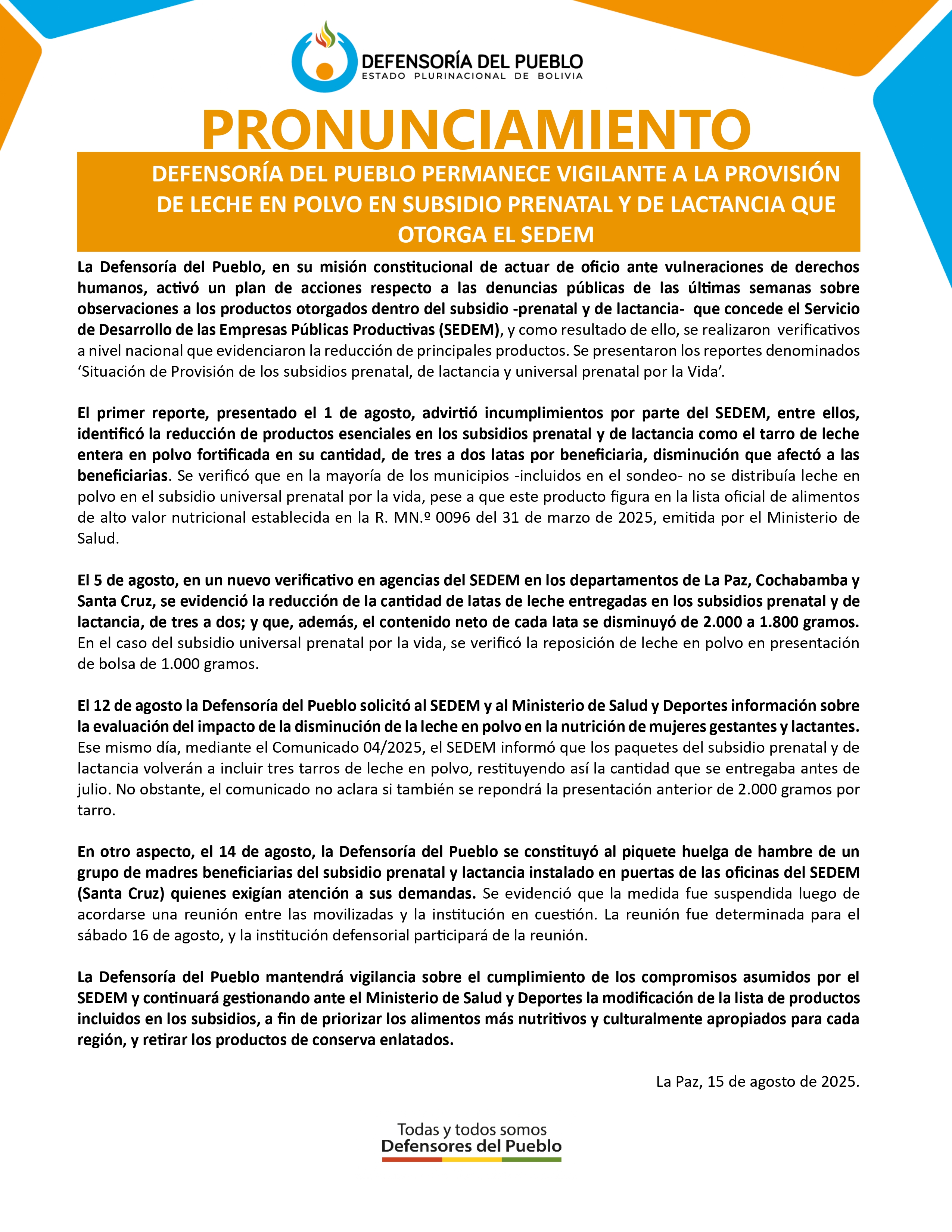 El 12 de agosto la Defensoría del Pueblo solicitó al SEDEM y al Ministerio de Salud y Deportes información sobre la evaluación del impacto de la disminución de la leche en polvo en la nutrición de mujeres gestantes y lactantes. Ese mismo día, mediante el Comunicado 04/2025, el SEDEM informó que los paquetes del subsidio prenatal y de lactancia volverán a incluir tres tarros de leche en polvo, restituyendo así la cantidad que se entregaba antes de julio. No obstante, el comunicado no aclara si también se repondrá la presentación anterior de 2.000 gramos por tarro.