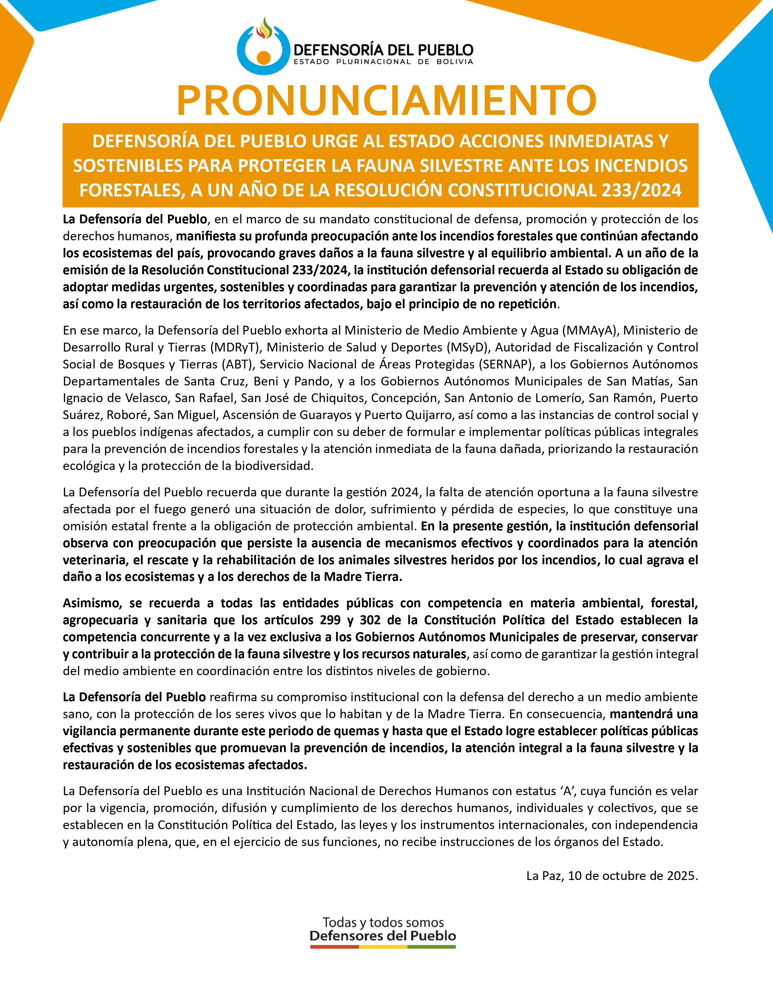 En ese marco, la Defensoría del Pueblo exhorta al Ministerio de Medio Ambiente y Agua (MMAyA), Ministerio de Desarrollo Rural y Tierras (MDRyT), Ministerio de Salud y Deportes (MSyD), Autoridad de Fiscalización y Control Social de Bosques y Tierras (ABT), Servicio Nacional de Áreas Protegidas (SERNAP), a los Gobiernos Autónomos Departamentales de Santa Cruz, Beni y Pando, y a los Gobiernos Autónomos Municipales de San Matías, San Ignacio de Velasco, San Rafael, San José de Chiquitos, Concepción, San Antonio de Lomerío, San Ramón, Puerto Suárez, Roboré, San Miguel, Ascensión de Guarayos y Puerto Quijarro, así como a las instancias de control social y a los pueblos indígenas afectados, a cumplir con su deber de formular e implementar políticas públicas integrales para la prevención de incendios forestales y la atención inmediata de la fauna dañada, priorizando la restauración ecológica y la protección de la biodiversidad.