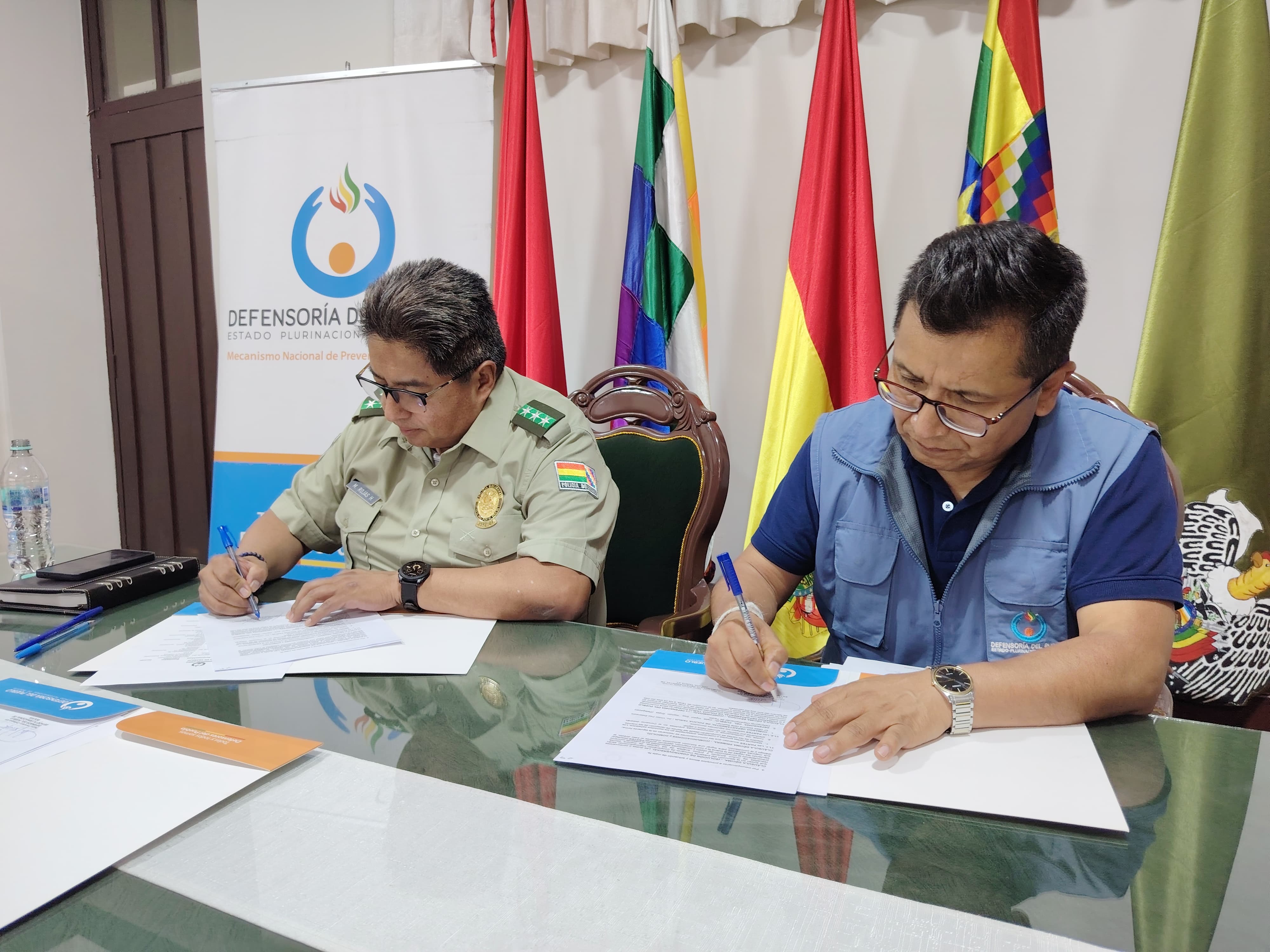 El convenio fue suscrito por el Defensor del Pueblo, Pedro Callisaya Aro, y el Comandante Departamental de la Policía Boliviana en Tarija, Cnl. Marco Antonio Rojas Hurtado, en instalaciones del Comando Departamental.