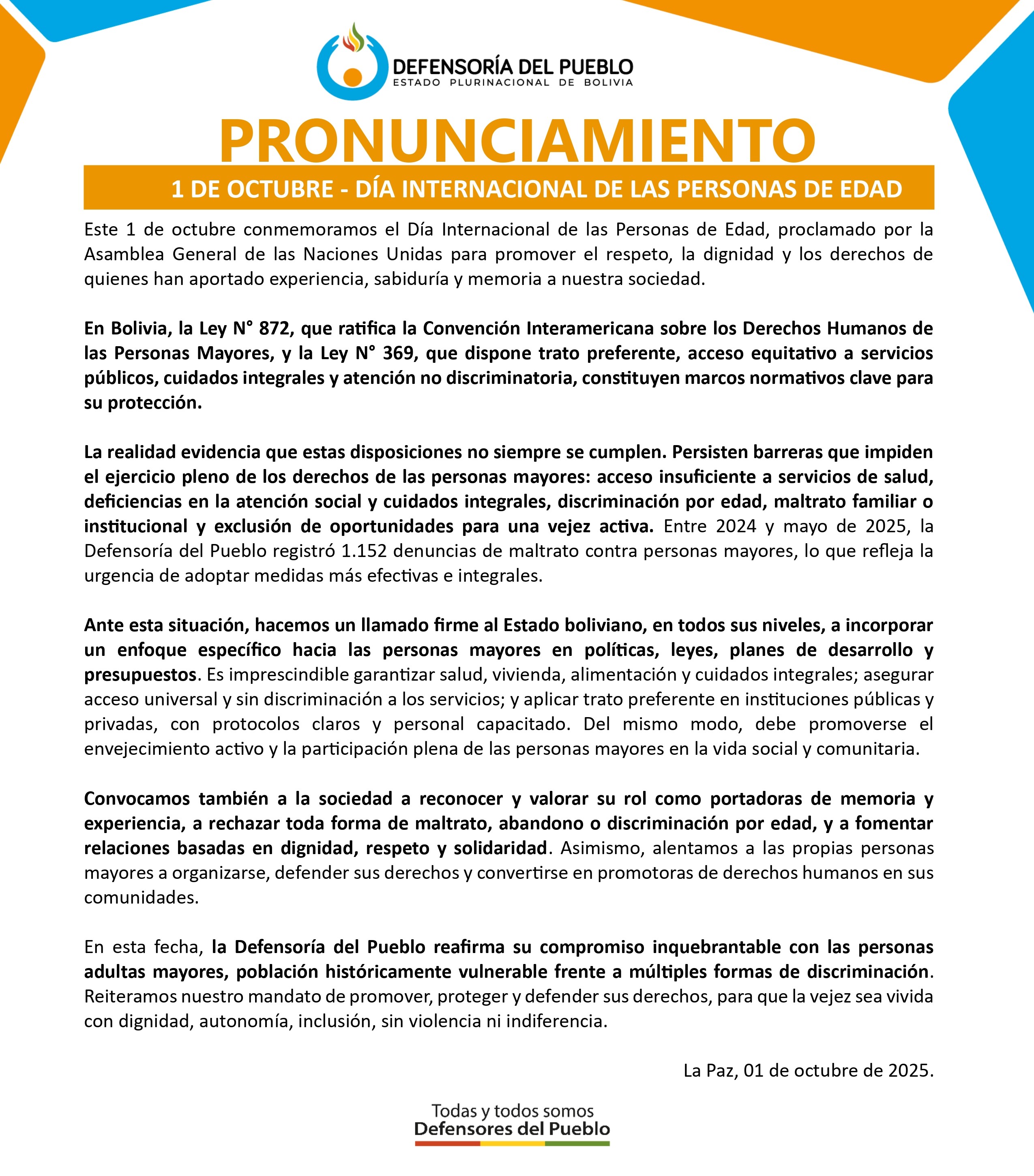 Ante esta situación, hacemos un llamado firme al Estado boliviano, en todos sus niveles, a incorporar un enfoque específico hacia las personas mayores en políticas, leyes, planes de desarrollo y presupuestos. Es imprescindible garantizar salud, vivienda, alimentación y cuidados integrales; asegurar acceso universal y sin discriminación a los servicios; y aplicar trato preferente en instituciones públicas y privadas, con protocolos claros y personal capacitado. Del mismo modo, debe promoverse el envejecimiento activo y la participación plena de las personas mayores en la vida social y comunitaria.