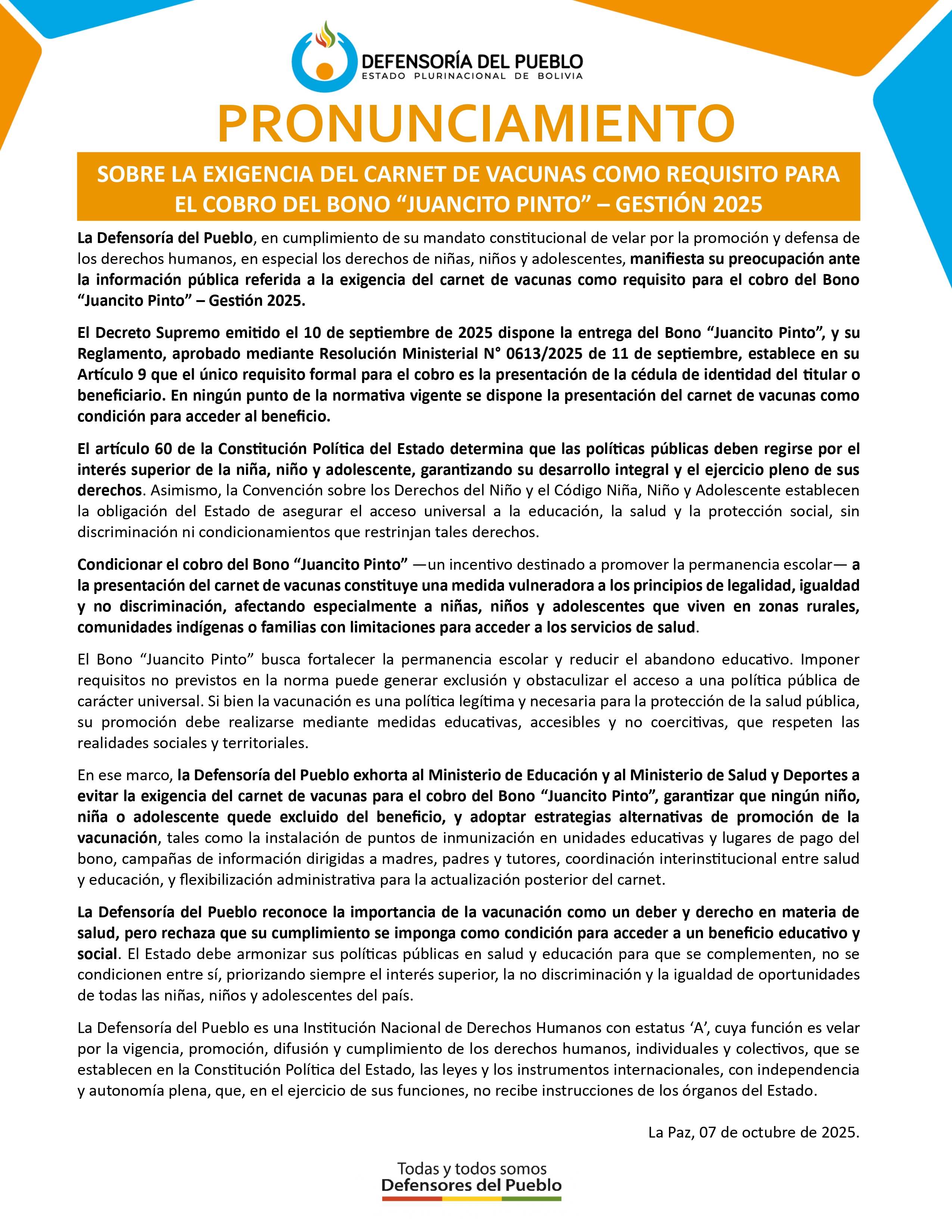 El Bono “Juancito Pinto” busca fortalecer la permanencia escolar y reducir el abandono educativo. Imponer requisitos no previstos en la norma puede generar exclusión y obstaculizar el acceso a una política pública de carácter universal. Si bien la vacunación es una política legítima y necesaria para la protección de la salud pública, su promoción debe realizarse mediante medidas educativas, accesibles y no coercitivas, que respeten las realidades sociales y territoriales.
