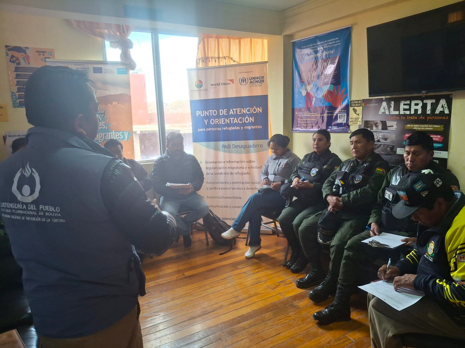 “La Unidad de Coordinación Regional de Desaguadero, por instrucción del Defensor del Pueblo, Pedro Callisaya Aro, organizó un conversatorio sobre trata y tráfico de personas con las instituciones involucradas en esta temática. Durante el evento, se abordaron temas como las estrategias para prevenir y combatir este delito y las dificultades en la lucha contra este delito”, informó José León Magne, responsable de la Oficina Regional de Desaguadero de la Defensoría del Pueblo.