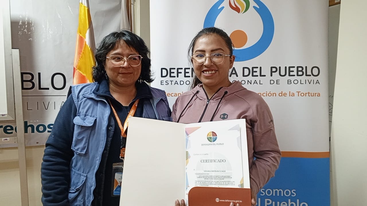El Alto, 24 de noviembre de 2025 (UCOM/UCREA). - La Defensoría del Pueblo realizó la entrega de certificados a promotoras comunitarias que concluyeron con el curso de “Actualización y Fortalecimiento en Prevención de Violencia en Razón de Género y Derechos de la Mujer”, una iniciativa orientada a reforzar los conocimientos y capacidades de las mujeres que desempeñan un rol clave en la defensa y promoción de los derechos humanos.