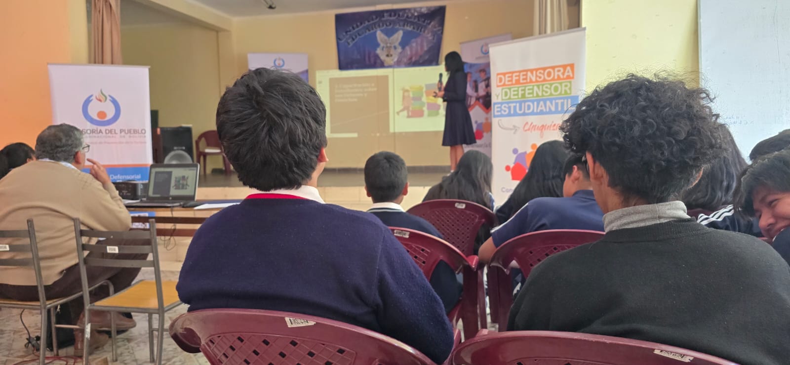 “Las y los Defensores Estudiantiles, compartieron con la comunidad educativa, el grado de cumplimiento de sus planes de trabajo, los avances en la implementación del Plan de Convivencia Pacífica y Armónica, las acciones de promoción de derechos, prevención de la violencia y discriminación”, informó el Delegado Defensorial de Chuquisaca, Humberto Mayorga.