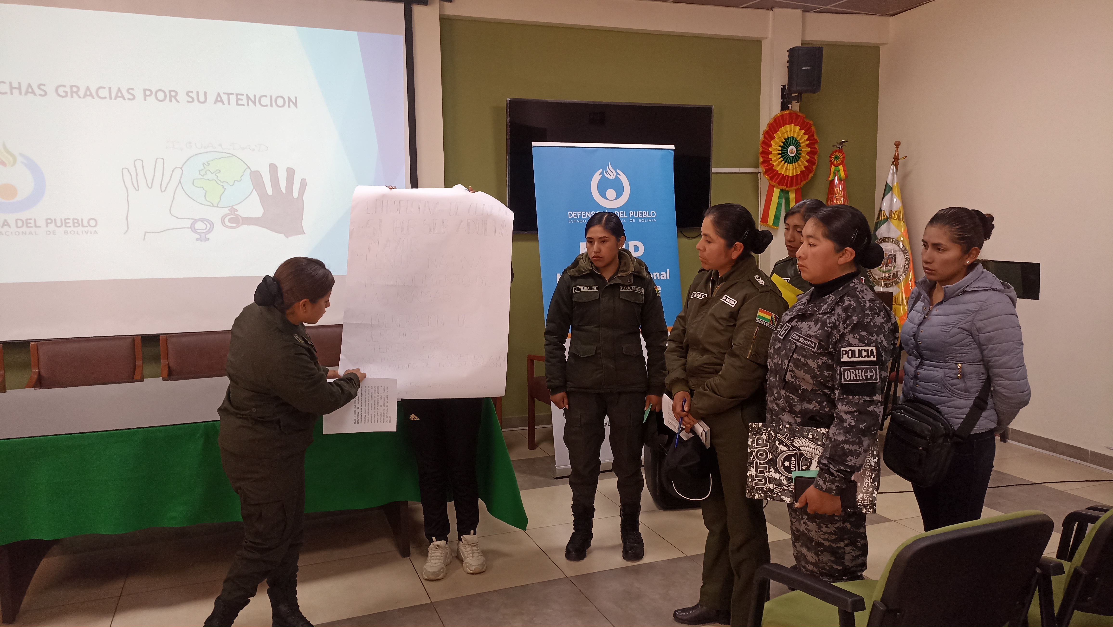 La Paz, 1 de septiembre de 2025 (UCOM/DDDLP).- Con el objetivo de promover y socializar los derechos humanos de las personas privadas de libertad (PPL) la Defensoría del Pueblo, a través de la Delegación Defensorial Departamental de La Paz, impartió un taller sobre esta temática con el enfoque de género y con una didáctica práctico reflexiva; la actividad estuvo dirigida a servidores policiales que coordinan con la Unidad de Género del Comando Departamental de Policía de La Paz.